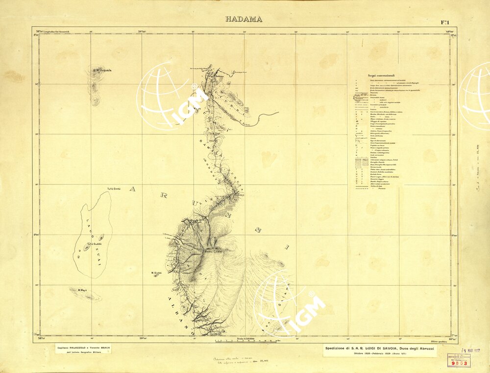 Carta in 9 fogli di dimensioni varie, i rilievi furono eseguiti dai topografi dell’ IGM al seguito della misssione esplorativa di S.A.R. il Duca degli Abruzzi dall’ Ottobre 1928 al Febbraio 1929, gli originali furono disegnati alla scala di 1:200.000 per la successiva riproduzione e pubblicazione alla scala di 1:250.000