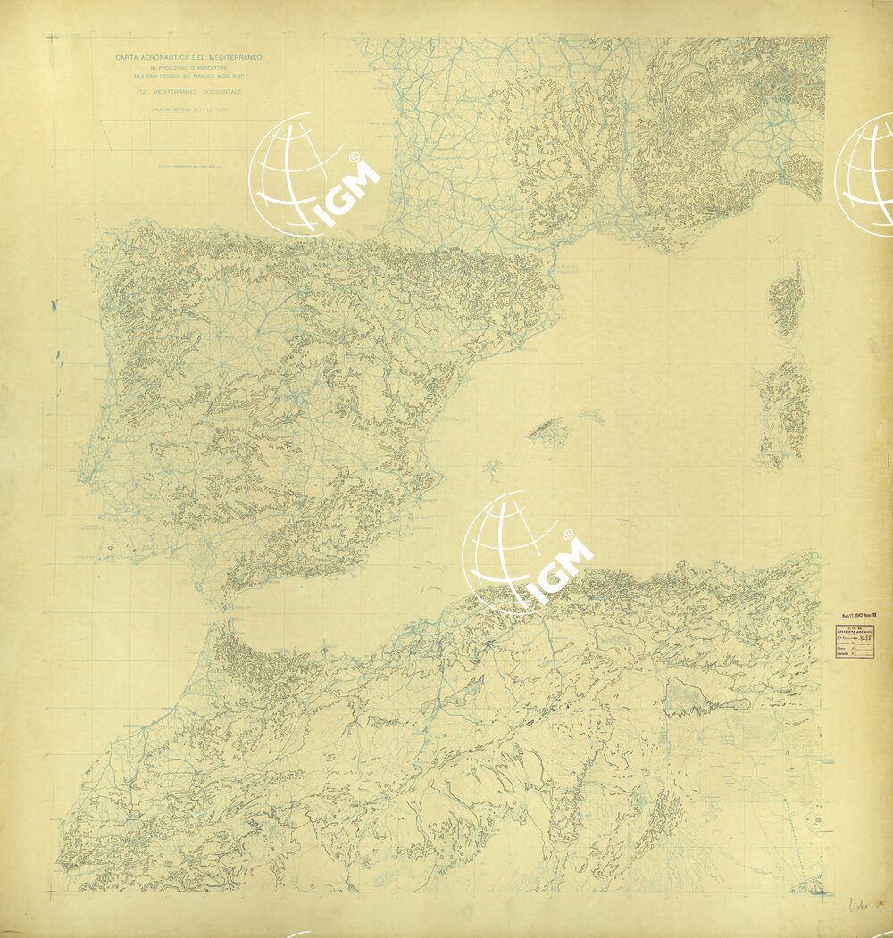 CARTA AERONAUTICA DEL MEDITERRANEO FOGLIO 2 MEDITERRANEO OCCIDENTALE ORIGINALI A COLORI SEPARATI ALTIMETRIA