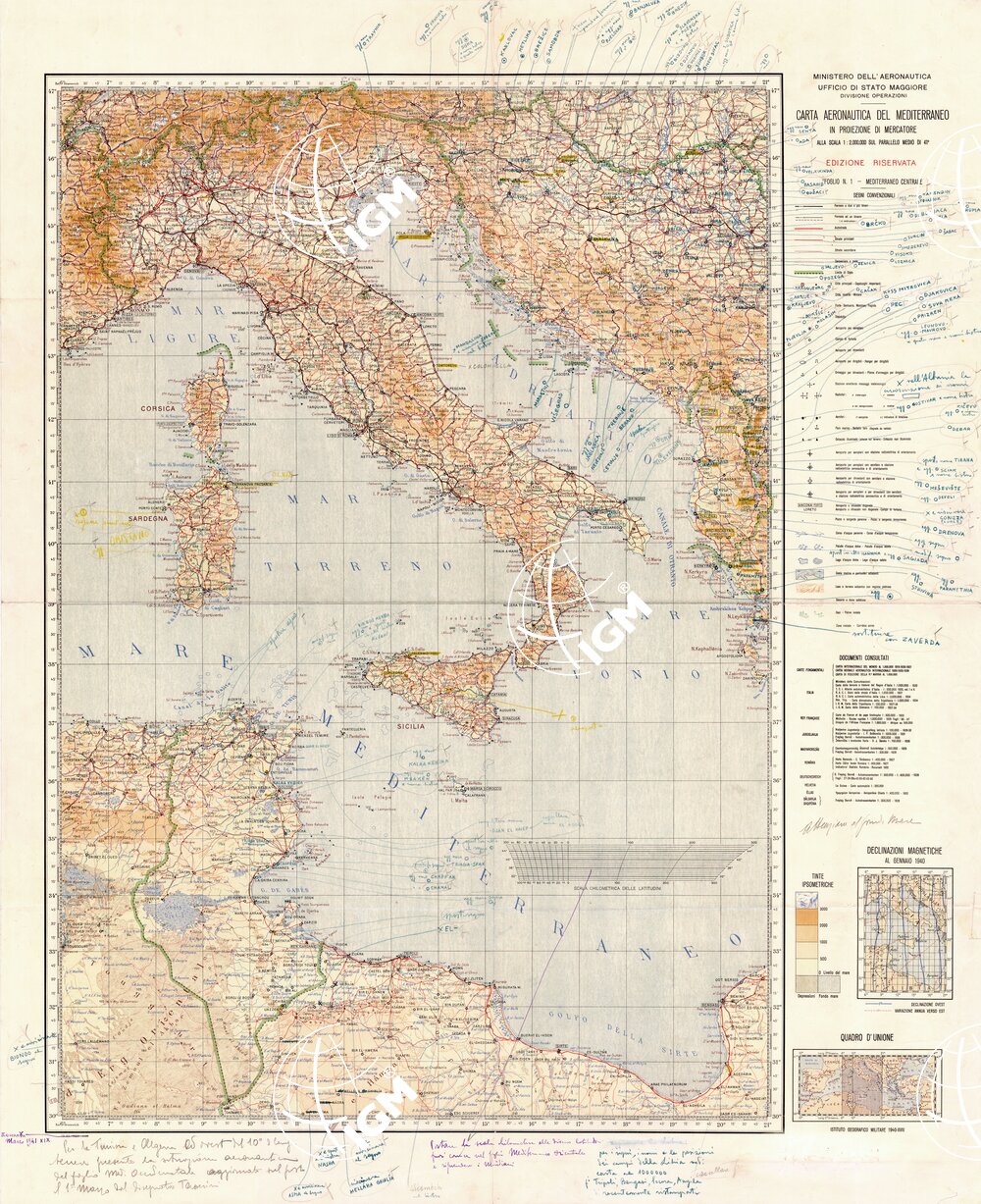 Lavoro eseguito dall’I.G.M. su richiesta del Ministero dell’Aeronautica,pubblicato in 3 fogli nel 1941. Originali disegnati su cartone metallizzato, dal parallelo medio 41°, in proiezione di Mercatore. La carta è derivata da quella Internazionale del Mondo, con aggiornamenti forniti dall’ Aeronautica, rappresenta la zona compresa tra 10° ovest, 41° est di longitudine Greenwich e 30° , 47° latitudine nord.