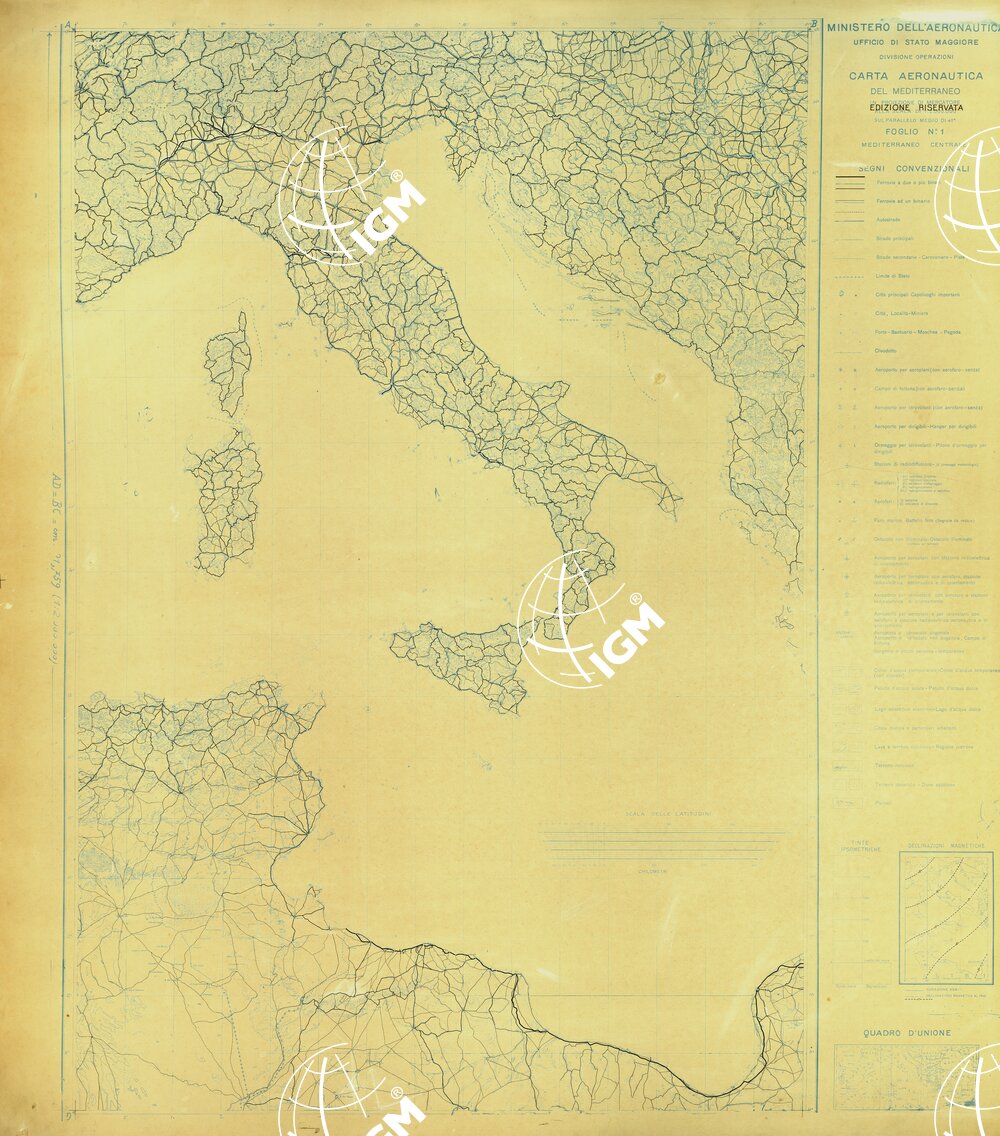 CARTA AERONAUTICA DEL MEDITERRANEO FOGLIO 1 MEDITERRANEO CENTRALE ORIGINALI A COLORI SEPARATI VIABILITA’