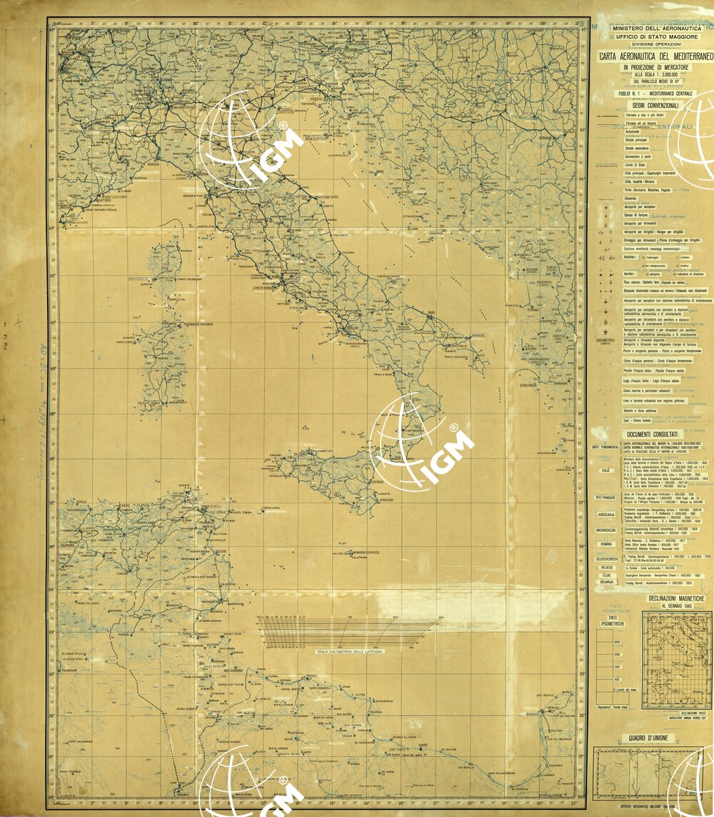 CARTA AERONAUTICA DEL MEDITERRANEO FOGLIO 1 MEDITERRANEO CENTRALE ORIGINALI A COLORI SEPARATI NERO