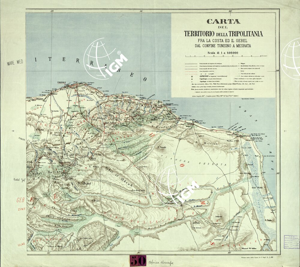 Carta del territorio della Tripolitania fra la costa ed il Gebel e tra il confine Tunisino e Misurata, divisa in 2 fogli Est e Ovest, compilata e disegnata tra il 1887 e il 1888 è una delle carte generali allestite dall’ IGM sui migliori documenti utilizzabili all’ epoca degli avvenimenti che portarono alla guerra Libica, gli originali sono disegnati su cartone, 1 per la planimetria e toponomastica e 1 per l’ orografia.