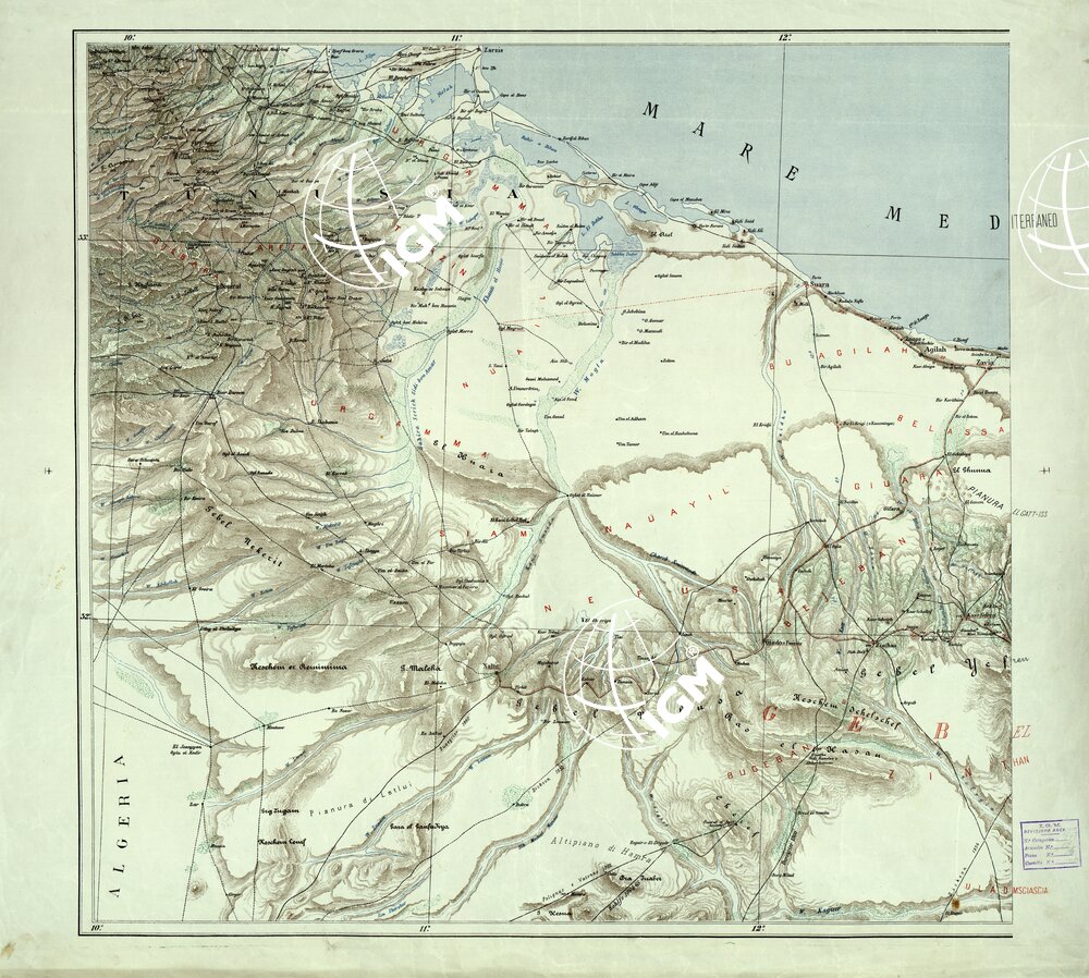 Carta del territorio della Tripolitania fra la costa ed il Gebel e tra il confine Tunisino e Misurata, divisa in 2 fogli Est e Ovest, compilata e disegnata tra il 1887 e il 1888 è una delle carte generali allestite dall’ IGM sui migliori documenti utilizzabili all’ epoca degli avvenimenti che portarono alla guerra Libica, gli originali sono disegnati su cartone, 1 per la planimetria e toponomastica e 1 per l’ orografia.