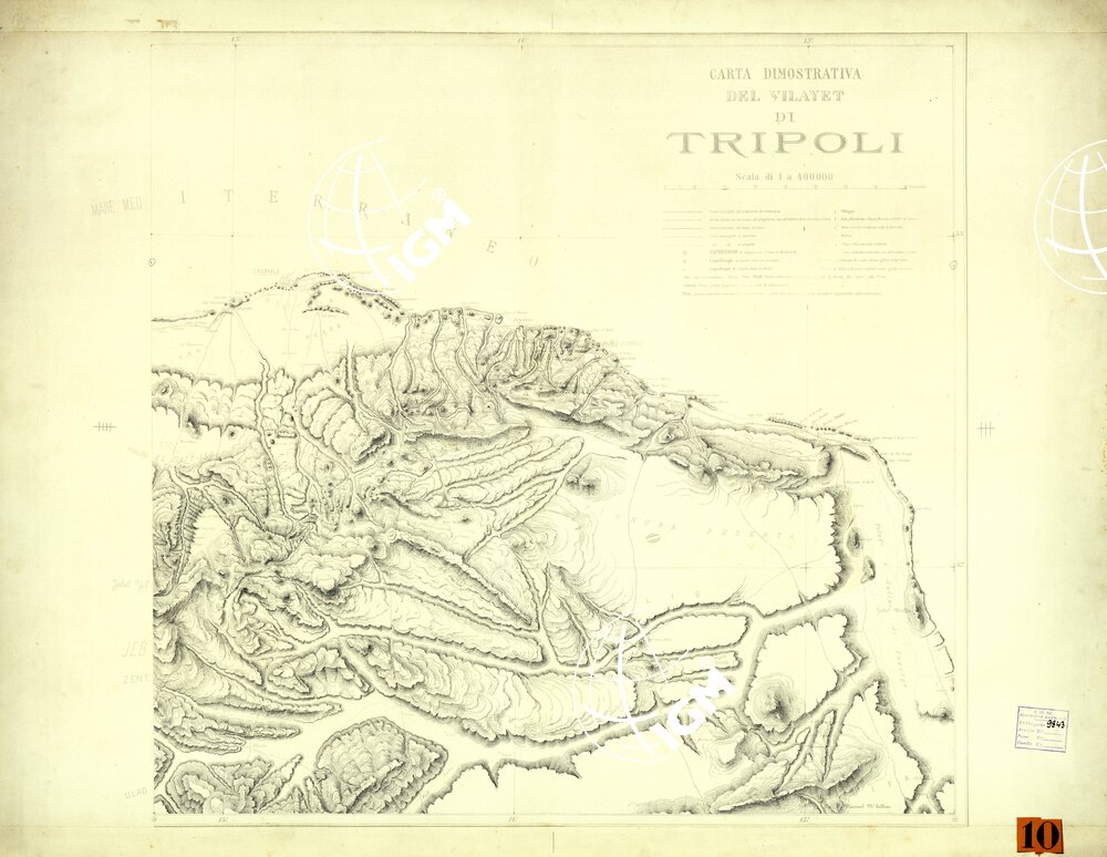 Carta del territorio della Tripolitania fra la costa ed il Gebel e tra il confine Tunisino e Misurata, divisa in 2 fogli Est e Ovest, compilata e disegnata tra il 1887 e il 1888 è una delle carte generali allestite dall’ IGM sui migliori documenti utilizzabili all’ epoca degli avvenimenti che portarono alla guerra Libica, gli originali sono disegnati su cartone, 1 per la planimetria e toponomastica e 1 per l’ orografia.