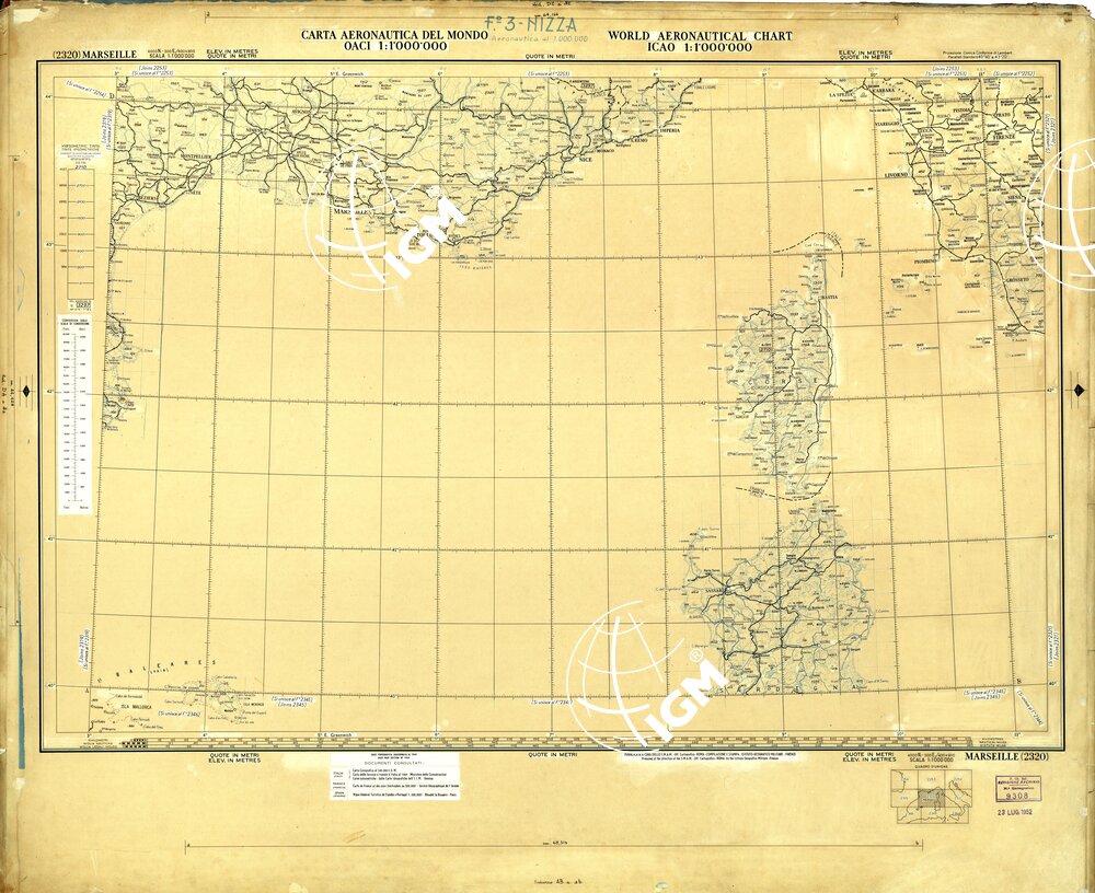 CARTA AERONAUTICA DEL MONDO FOGLIO 2320 MARSEILLE ORIGINALI A COLORI SEPARATI NERO