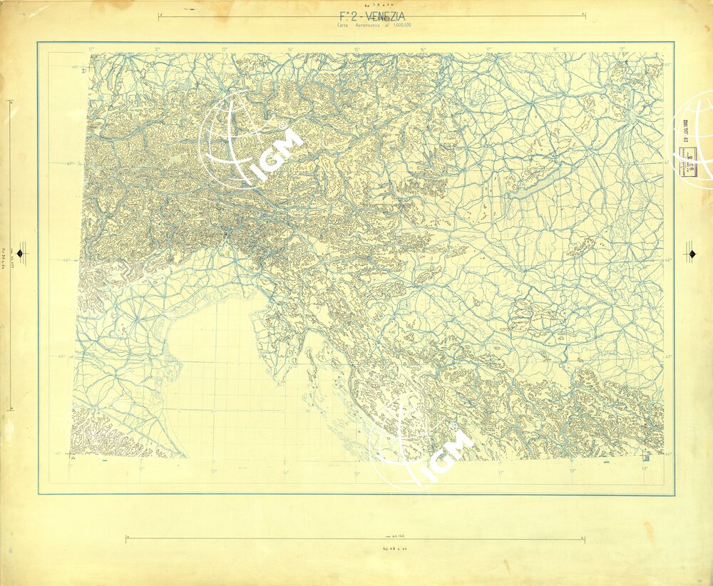 Compilazione e stampa dell’I.G.M. per conto dello Stato Maggiore dell’ Areonautico. Proiezione “Conica Conforme” di Lambert. Base topografica al 1949, con successivo parziale aggiornamento dell’ idrografia e delle quote. Paralleli standard 44°40′ e 47°20′. Carta realizzata in conformita’ delle norme internazionali O.A.C.I. e derivata dalla carta Aeronautica 1:500.000.