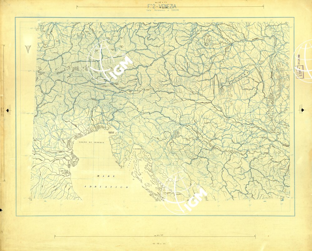 Compilazione e stampa dell’I.G.M. per conto dello Stato Maggiore dell’ Areonautico. Proiezione “Conica Conforme” di Lambert. Base topografica al 1949, con successivo parziale aggiornamento dell’ idrografia e delle quote. Paralleli standard 44°40′ e 47°20′. Carta realizzata in conformita’ delle norme internazionali O.A.C.I. e derivata dalla carta Aeronautica 1:500.000.
