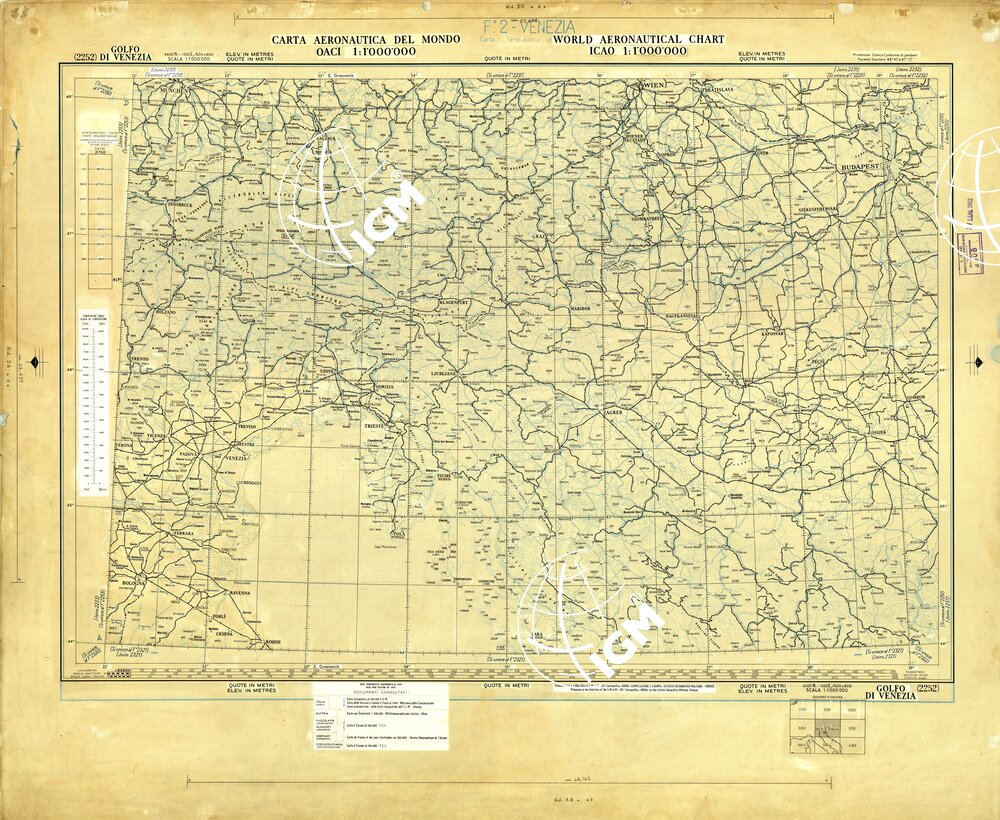 Compilazione e stampa dell’I.G.M. per conto dello Stato Maggiore dell’ Areonautico. Proiezione “Conica Conforme” di Lambert. Base topografica al 1949, con successivo parziale aggiornamento dell’ idrografia e delle quote. Paralleli standard 44°40′ e 47°20′. Carta realizzata in conformita’ delle norme internazionali O.A.C.I. e derivata dalla carta Aeronautica 1:500.000.