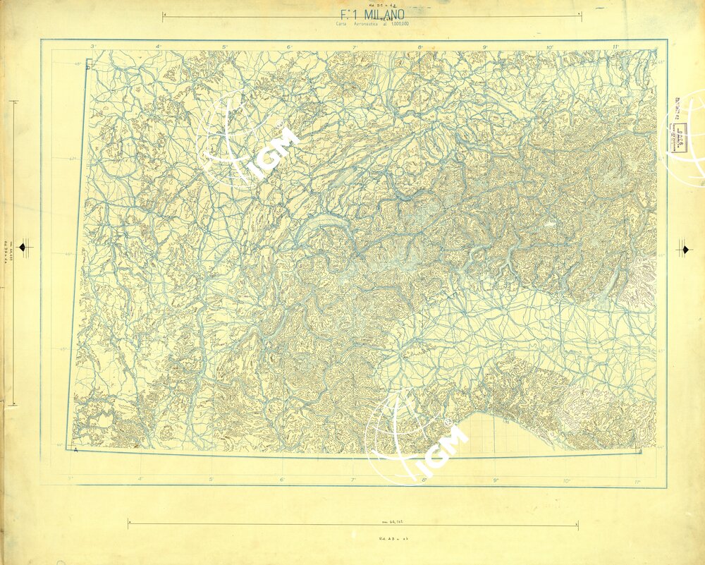 Compilazione e stampa dell’I.G.M. per conto dello Stato Maggiore dell’ Areonautico. Proiezione “Conica Conforme” di Lambert. Base topografica al 1949, con successivo parziale aggiornamento dell’ idrografia e delle quote. Paralleli standard 44°40′ e 47°20′. Carta realizzata in conformita’ delle norme internazionali O.A.C.I. e derivata dalla carta Aeronautica 1:500.000.