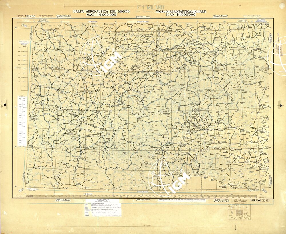Compilazione e stampa dell’I.G.M. per conto dello Stato Maggiore dell’ Areonautico. Proiezione “Conica Conforme” di Lambert. Base topografica al 1949, con successivo parziale aggiornamento dell’ idrografia e delle quote. Paralleli standard 44°40′ e 47°20′. Carta realizzata in conformita’ delle norme internazionali O.A.C.I. e derivata dalla carta Aeronautica 1:500.000.