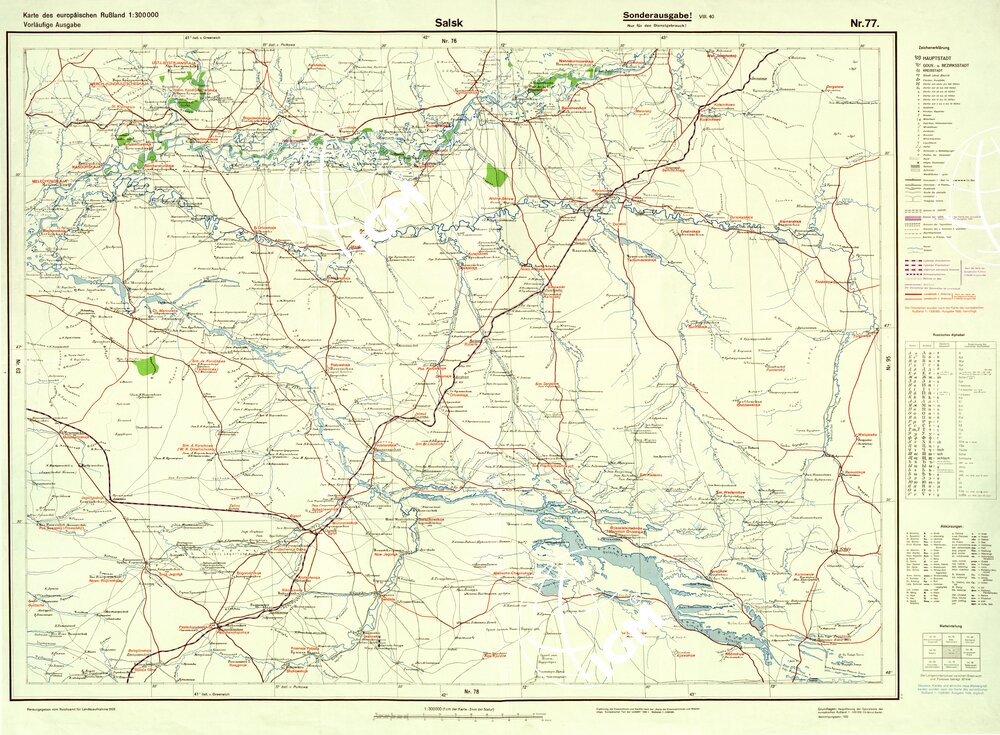 Carta Tedesca derivata da ingrandimento della carta della Russia Europea alla scala di 1:420.000 del 1932, aggiornamenti per ferrovie, canali, bacini e impianti idrici furono ricavati dalla carta della Russia Europea alla scala di 1:500.000 del 1938 e dalla carta delle ferrovie e comunicazioni idriche della Russia Europea alla scala di 1:5.500.000 del 1940.
