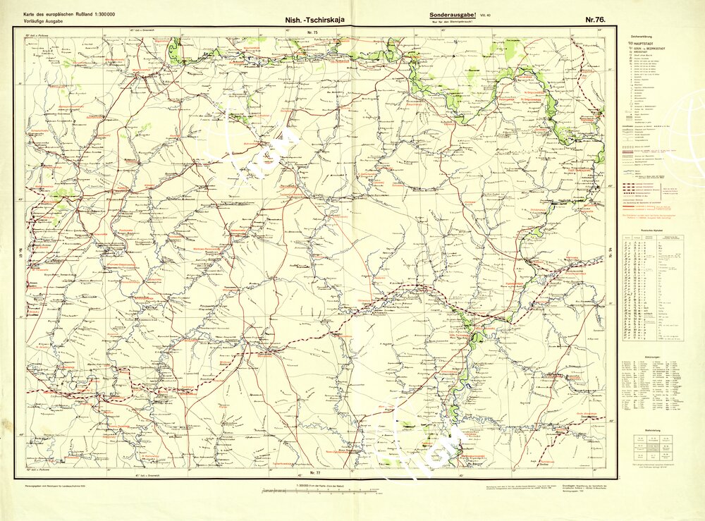 Carta Tedesca derivata da ingrandimento della carta della Russia Europea alla scala di 1:420.000 del 1932, aggiornamenti per ferrovie, canali, bacini e impianti idrici furono ricavati dalla carta della Russia Europea alla scala di 1:500.000 del 1938 e dalla carta delle ferrovie e comunicazioni idriche della Russia Europea alla scala di 1:5.500.000 del 1940.