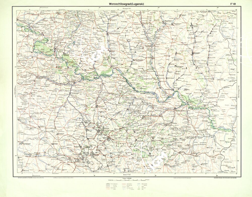 Carta realizzata dall’ IGM su richiesta del Comando della 8° armata in Russia. Compilata con elementi cartografici forniti dalla 33° sezione topocartografica dell’ ufficio operazioni del C.S.I.R. fù stampata nel Febbraio 1942.