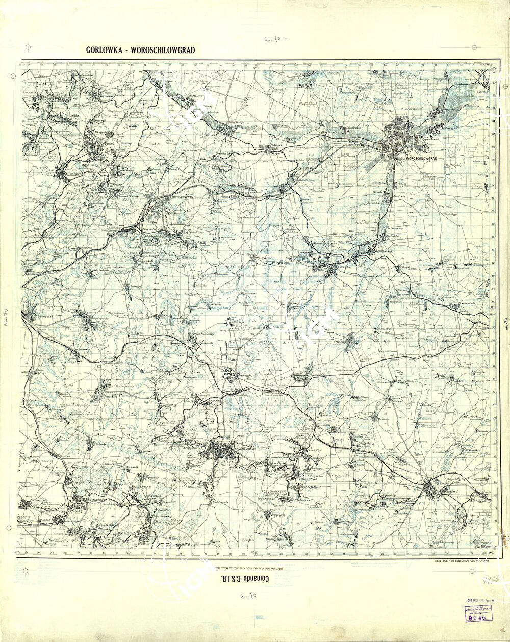 Carta realizzata dalla divisione cartografica dell’ IGM pubblicata nel 1942, gli originali divisi in 2 parti Est e Ovest furono ricavati dalla carta Russa alla stessa scala del 1940 – 1941 aggiornati per i centri abitati di Rykowo e Debalizewo con fotografie aeree fornite dall’ aeronautica Tedesca.
