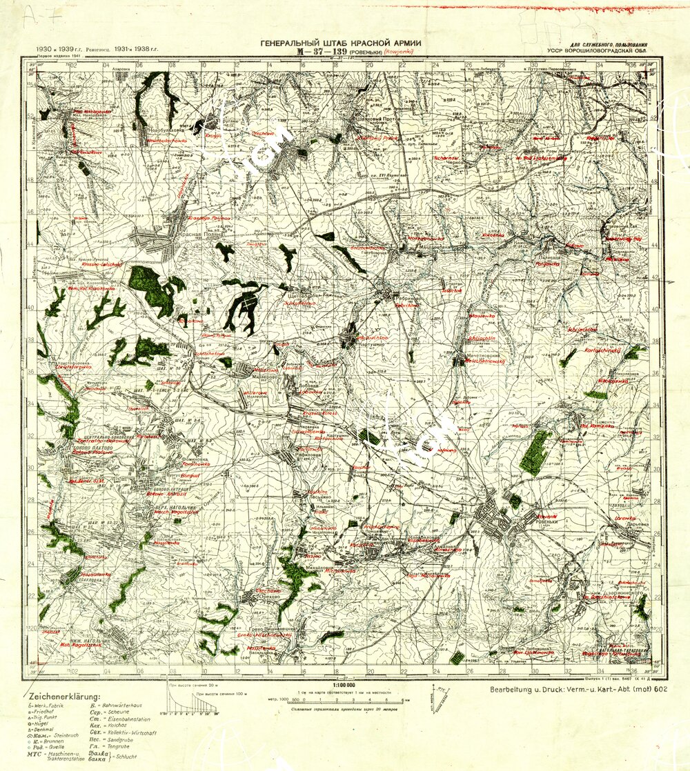 Carta Tedesca riproduzione da analoga carta Russa con traduzione della toponomastica, esiste anche un montaggio dei fogli M – 37 -125 Artemowsk e M – 37 – 137 Gorlowka ( File SE007897 )