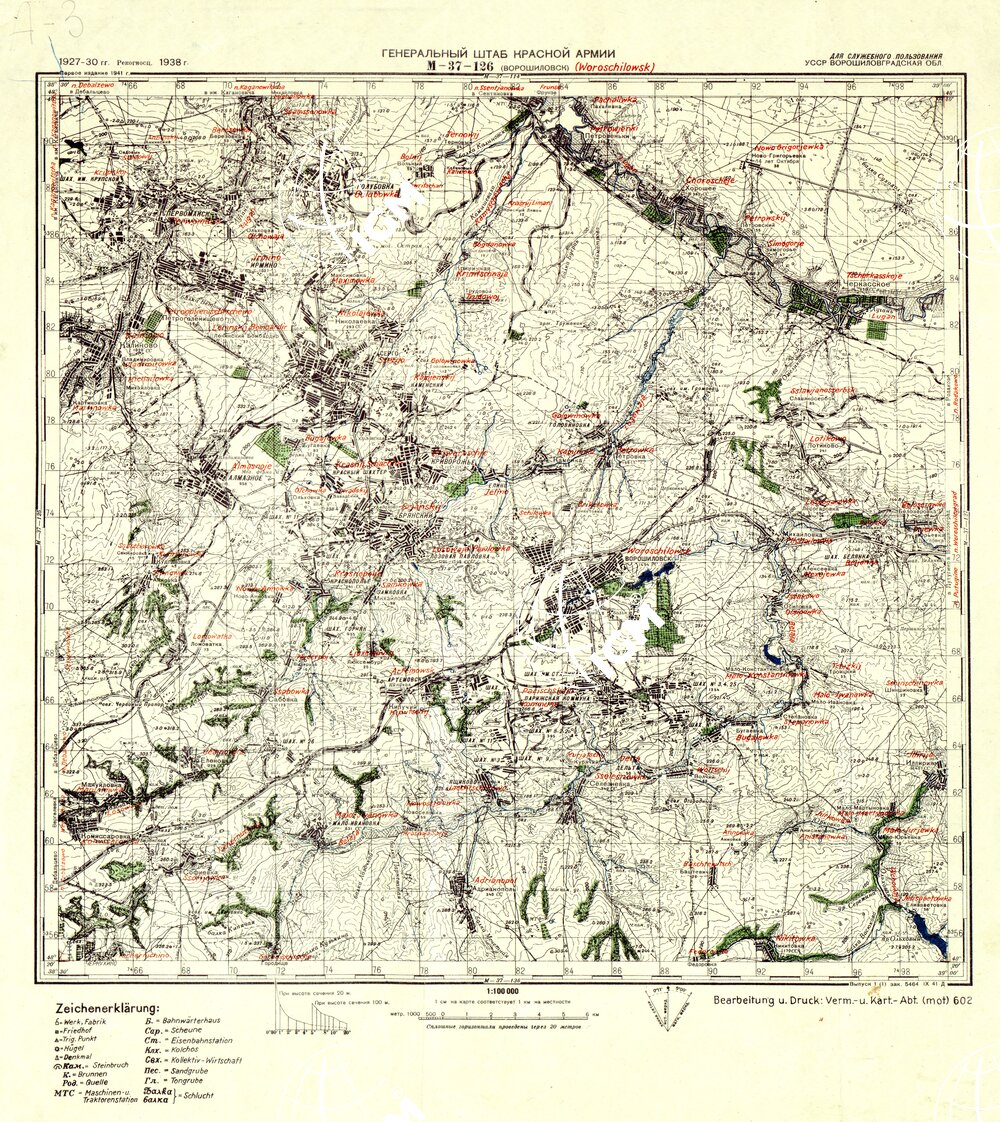 Carta Tedesca riproduzione da analoga carta Russa con traduzione della toponomastica, esiste anche un montaggio dei fogli M – 37 -125 Artemowsk e M – 37 – 137 Gorlowka ( File SE007897 )