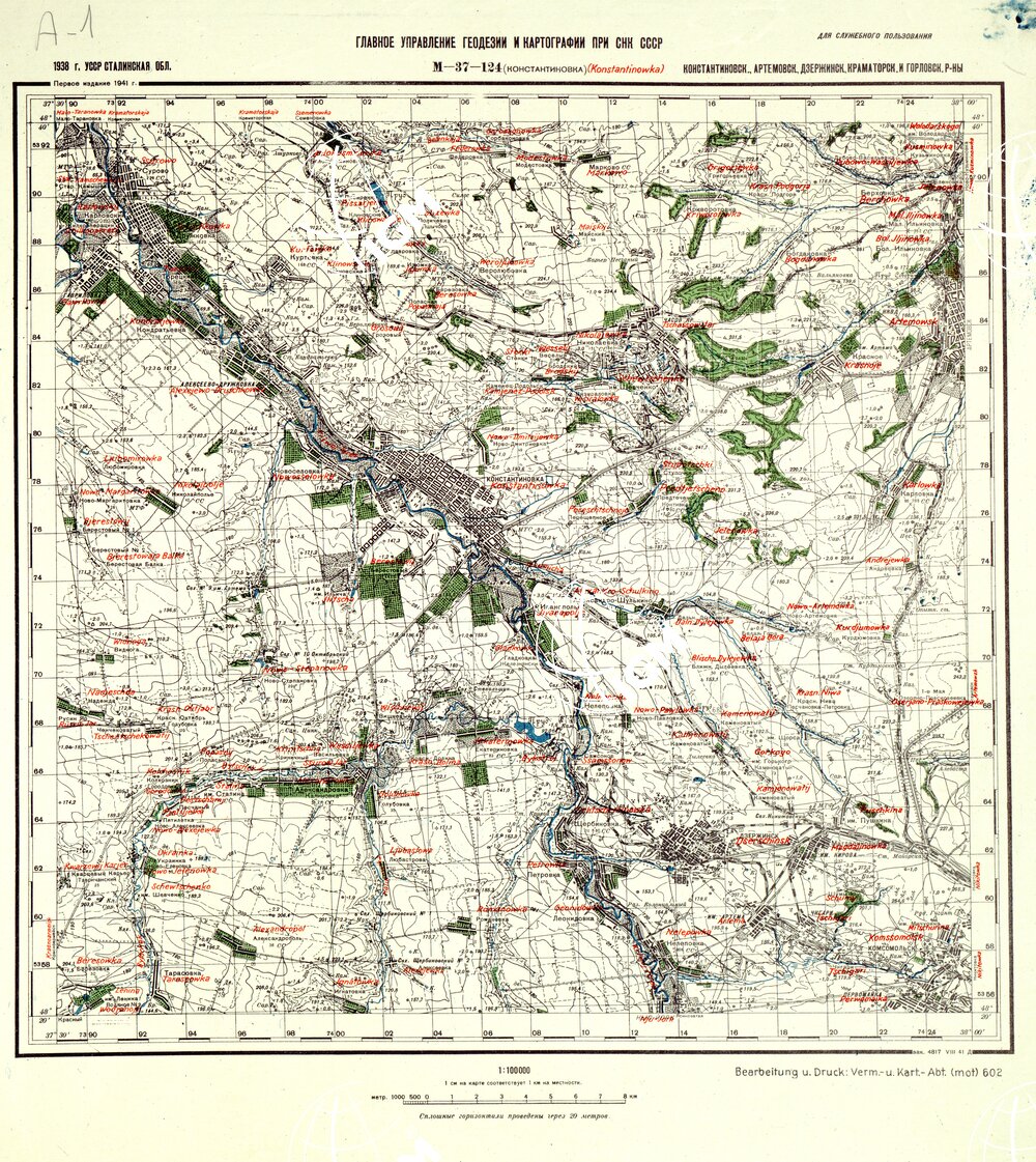 Carta Tedesca riproduzione da analoga carta Russa con traduzione della toponomastica, esiste anche un montaggio dei fogli M – 37 -125 Artemowsk e M – 37 – 137 Gorlowka ( File SE007897 )