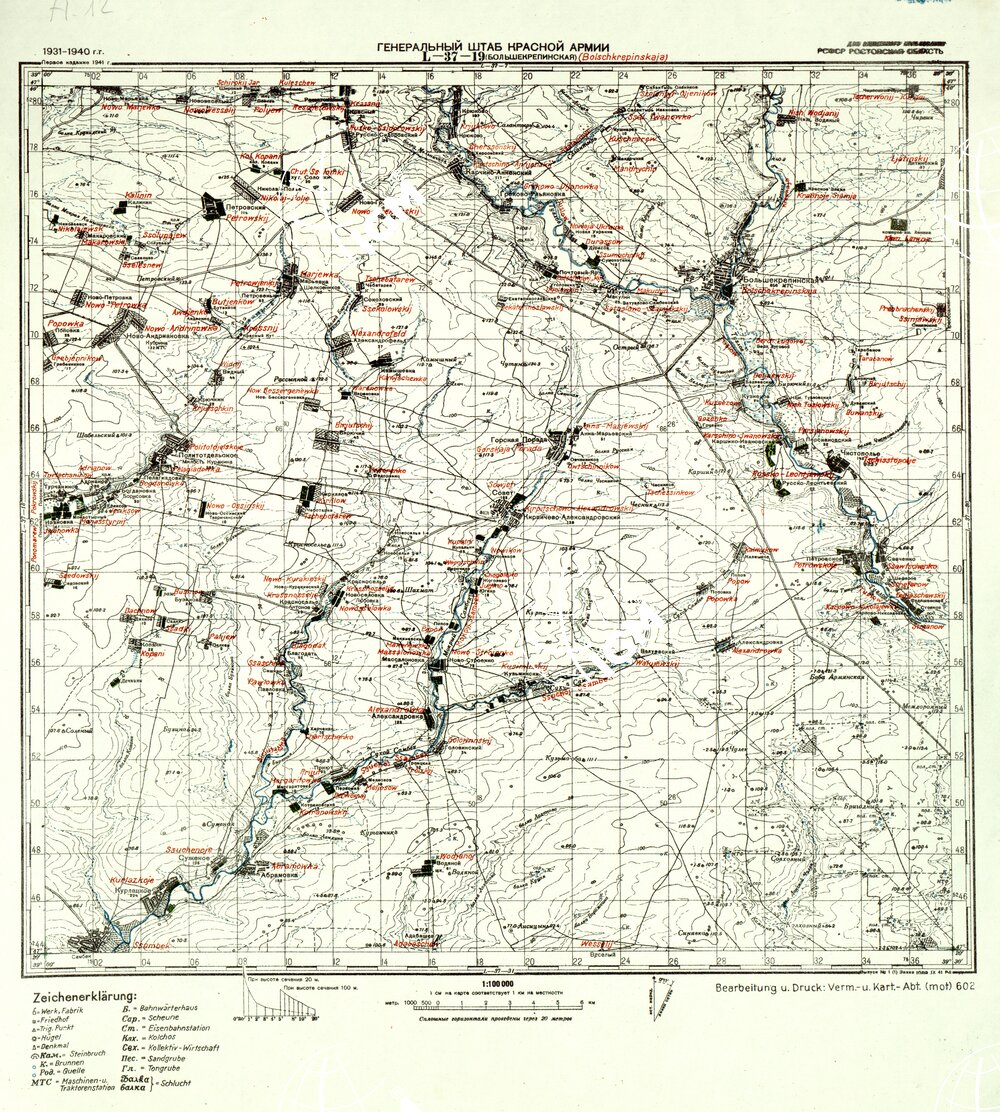 Carta Tedesca riproduzione da analoga carta Russa con traduzione della toponomastica, esiste anche un montaggio dei fogli M – 37 -125 Artemowsk e M – 37 – 137 Gorlowka ( File SE007897 )