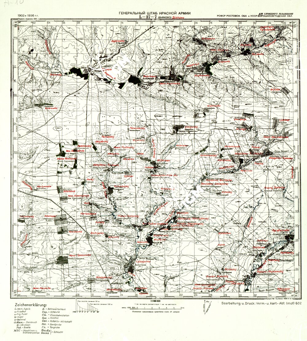 Carta Tedesca riproduzione da analoga carta Russa con traduzione della toponomastica, esiste anche un montaggio dei fogli M – 37 -125 Artemowsk e M – 37 – 137 Gorlowka ( File SE007897 )