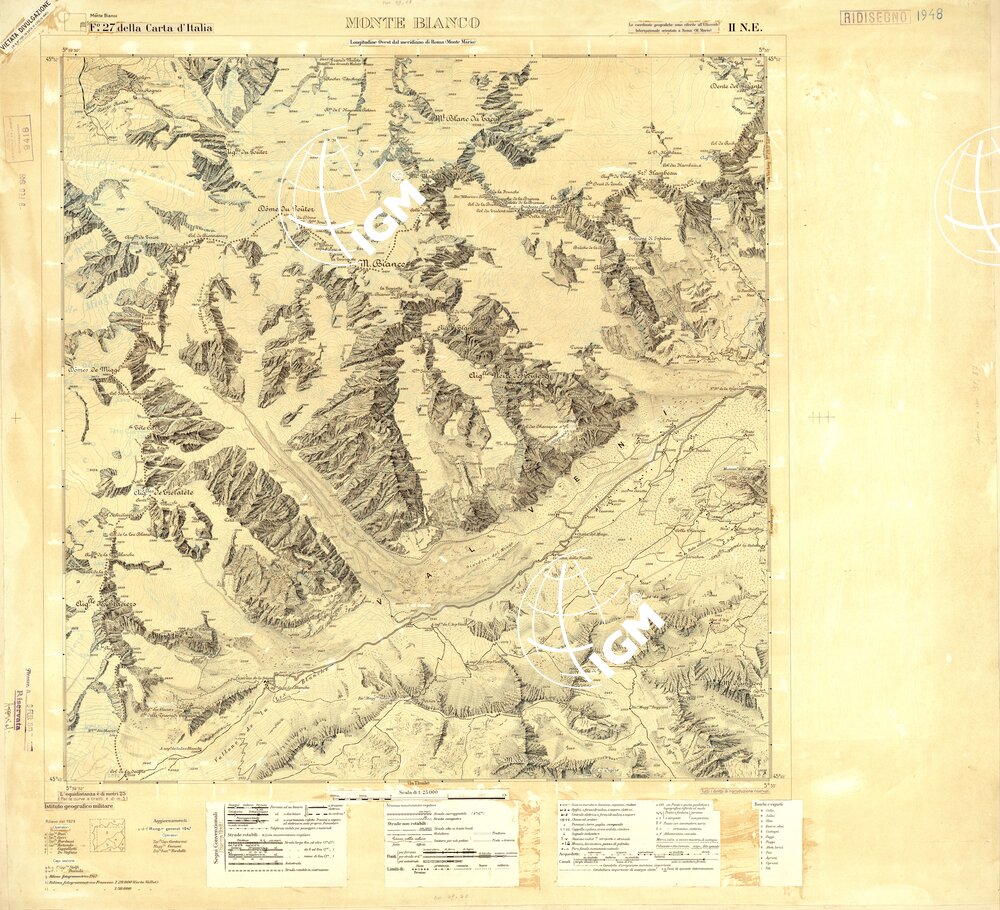 Nel 1947 la direzione I.G.M. decise il rifacimento della parte artistica d’alta montagna delle tavolette del Monte Bianco e la Vachey rilevate nel 1929.