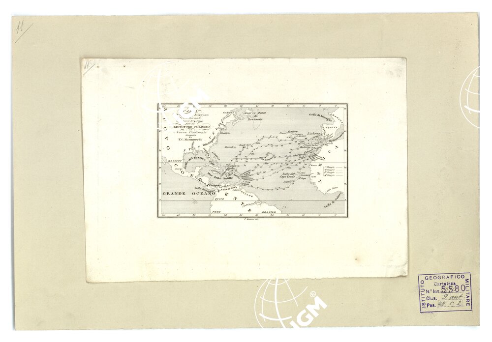 AMERICA – CARTA DELL’OCEANO ATLANTICO SETTENTRIONALE CON LE TRACCE DEI 4 VIAGGI FATTI DA CRISTOFORO COLOMBO AL NUOVO CONTINENTE