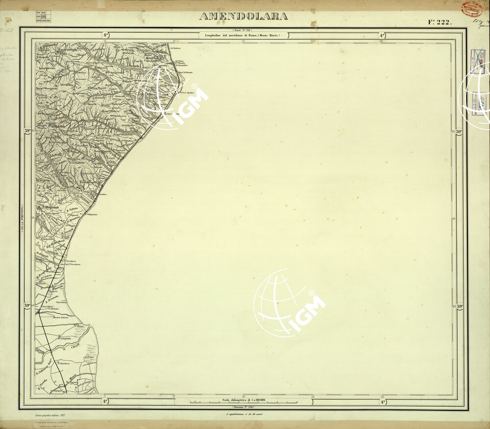 Vecchia edizione, originali in grande formato. Carta monocolore disegnata a penna su carta da disegno montata su cartone. Proiezione naturale. Rilievo del 1881/1898.