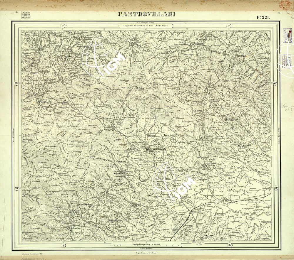 Vecchia edizione, originali in grande formato. Carta monocolore disegnata a penna su carta da disegno montata su cartone. Proiezione naturale. Rilievo del 1881/1898.