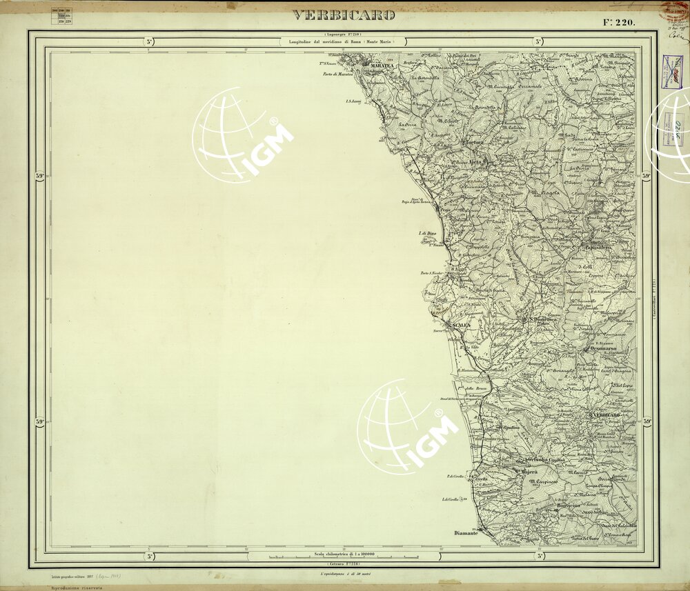 Vecchia edizione, originali in grande formato. Carta monocolore disegnata a penna su carta da disegno montata su cartone. Proiezione naturale. Rilievo del 1881/1898.