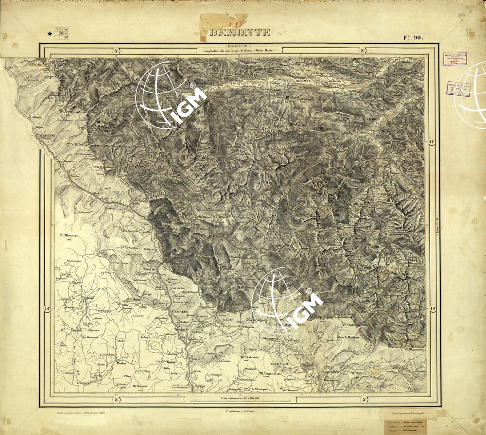 Edizione a tratteggio, originali in grande formato. Carta monocolore disegnata a penna su carta da disegno montata su cartone. Proiezione naturale. Rilievo del 1880’1892.
