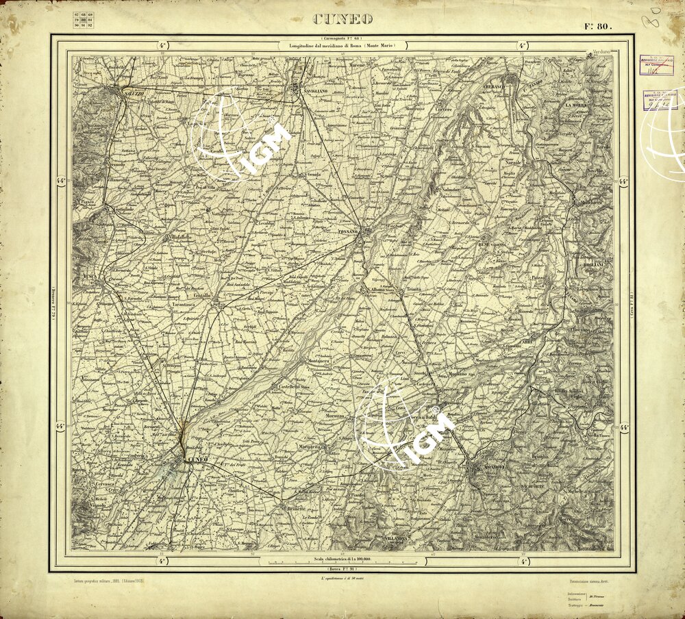 Edizione a tratteggio, originali in grande formato. Carta monocolore disegnata a penna su carta da disegno montata su cartone. Proiezione naturale. Rilievo del 1880’1892.