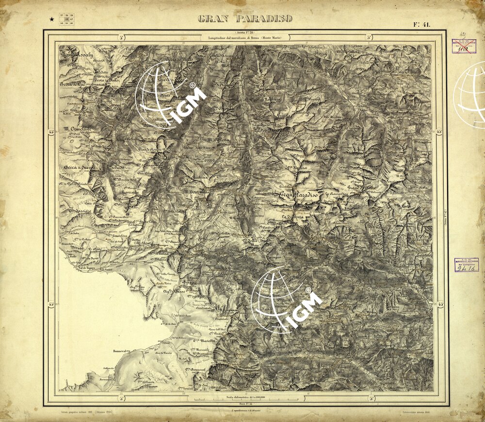 Edizione a tratteggio, originali in grande formato. Carta monocolore disegnata a penna su carta da disegno montata su cartone. Proiezione naturale. Rilievo del 1880’1892.