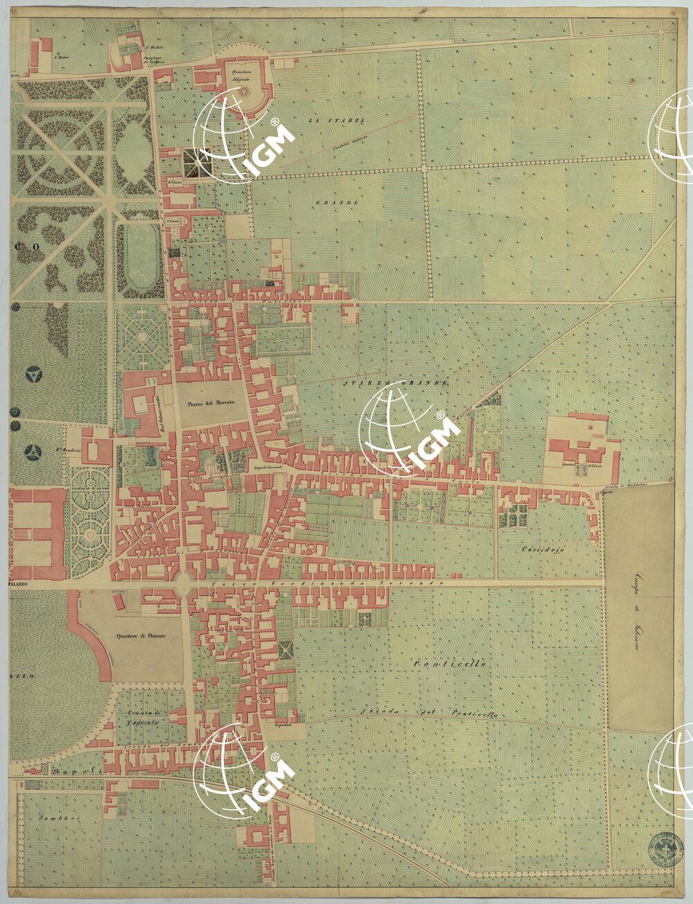Scala 1:2.000. Bella grande pianta in due fogli riuniti e montati su tela, disegnata a colori rosso per le costruzioni, verde per i giardini e le colture; è tratta dalle minute del documento CITTA' DI CASERTA E DINTORNI.