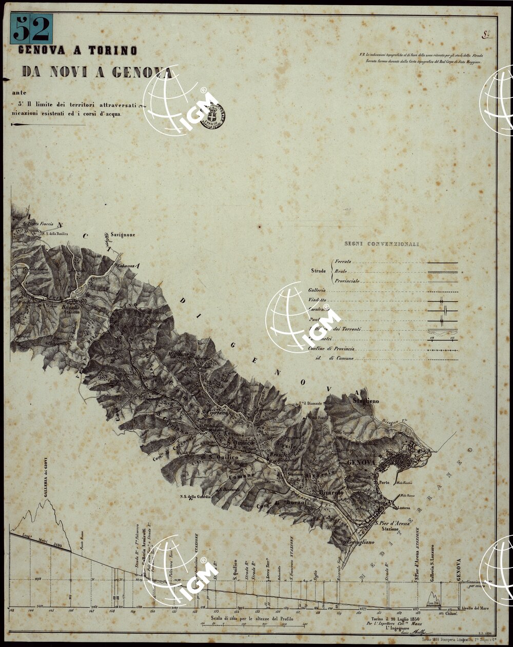 STRADA FERRATA DA GENOVA A TORINO PIANO DELLA LINEA DA NOVI A GENOVA INDICANTE 1°IL NUMERO, 2° LE STAZIONI E FERMATE 3° IL LIMITI DEI TERRERRITO ATTRAVERSATI 4° IL MODO IN CUI SI ATTRAVERSANO LE COMUNICAZIONI ESISTENTI ED I CORSI D’ACQUA.