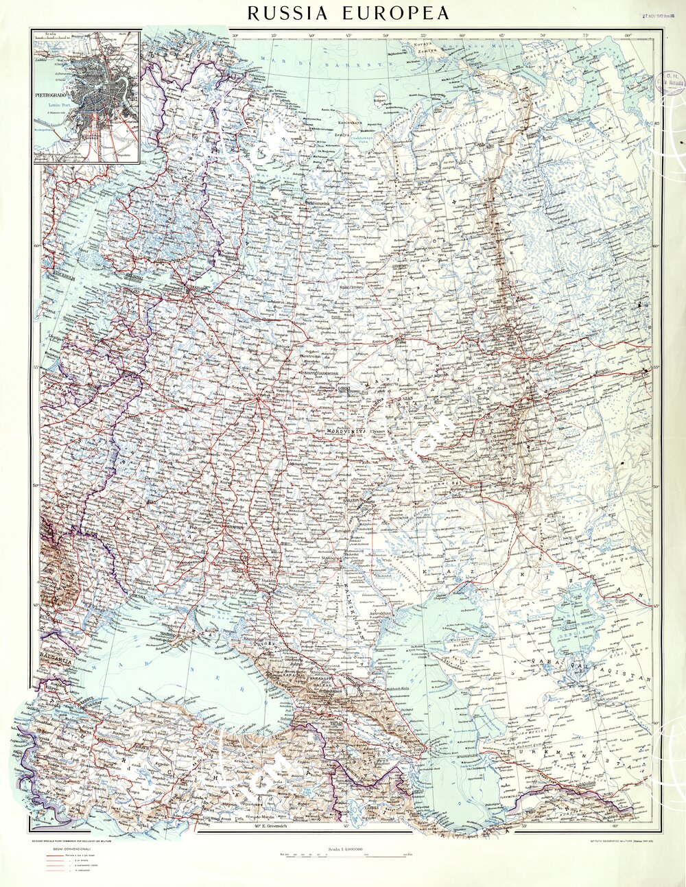 Ingrandimento dalla tavola 66-67 dell’ atlante del touring club alla scala di 1:7.500.000 , nell’ angolo in alto a sinistra un riquadro con la pianta di Leningrado ( Pietrogrado ) in scala 1:150.000 circa