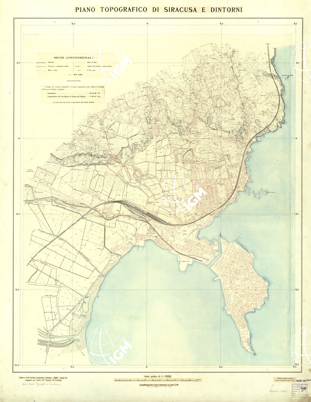 Rilievo eseguito dall’ IGM per conto del Comune di Siracusa, da questa carta è stato ricavato un ingrandimento alla scala di 1:2.000 in 6 fogli più quadro di unione ( stesso categorico )