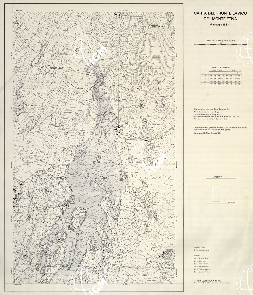 Carta richiesta dalla Commissione Tecnica istituita dal Ministero della Protezione Civile presso la Prefettura di Catania per la pianificazione degli interventi sulla eruzione vulcanica dell’ Aprile 1983 copia eliografica dell’ elaborato cartografico speditivo ottenuto con la sola restituzione fotogrammetrica appoggiata ai particolari della carta IGM alla scala di 1:25.000 Foglio 262 III SO ingrandita alla scala di 1:10.000 riprese aeree IGM del 4 Maggio 1983