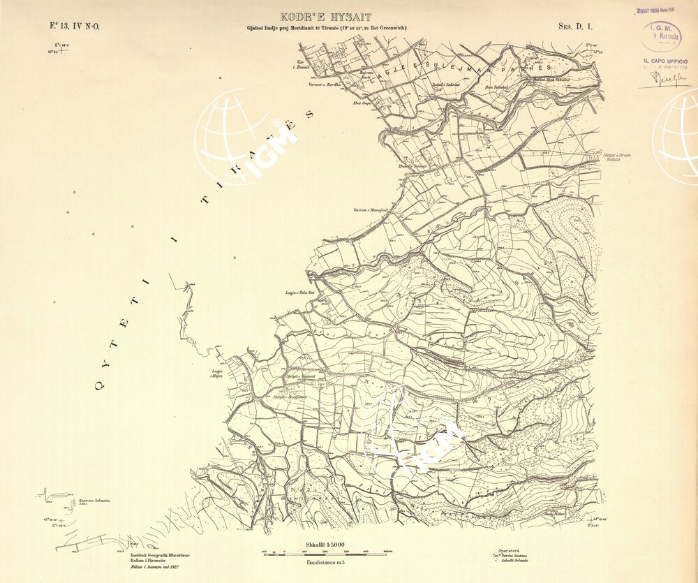 Rilievi alla scala di 1:5.000 eseguiti a scopo catastale per conto del Ministero delle Finanze Albanese negli anni 1927 1928 1929 in parte da operatori dell’ IGM e in parte, nella zona di Shijak, dalla ditta S.A.R.A. di Roma, alcune zone di particolare importanza furono rilevate alla scala di 1:2.500 ( Shijak dalla ditta S.A.R.A. Durazzo e Valona dall’ IGM )