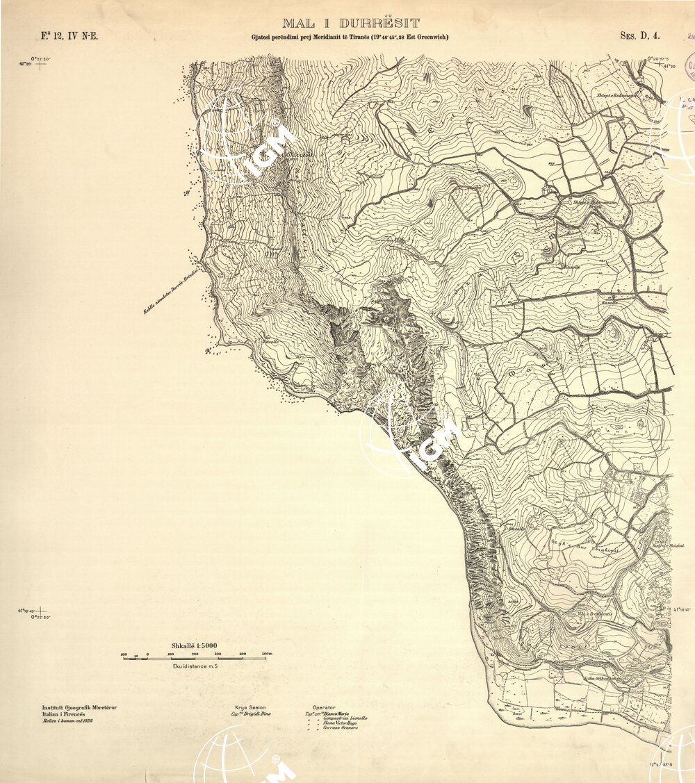 Rilievi alla scala di 1:5.000 eseguiti a scopo catastale per conto del Ministero delle Finanze Albanese negli anni 1927 1928 1929 in parte da operatori dell’ IGM e in parte, nella zona di Shijak, dalla ditta S.A.R.A. di Roma, alcune zone di particolare importanza furono rilevate alla scala di 1:2.500 ( Shijak dalla ditta S.A.R.A. Durazzo e Valona dall’ IGM )