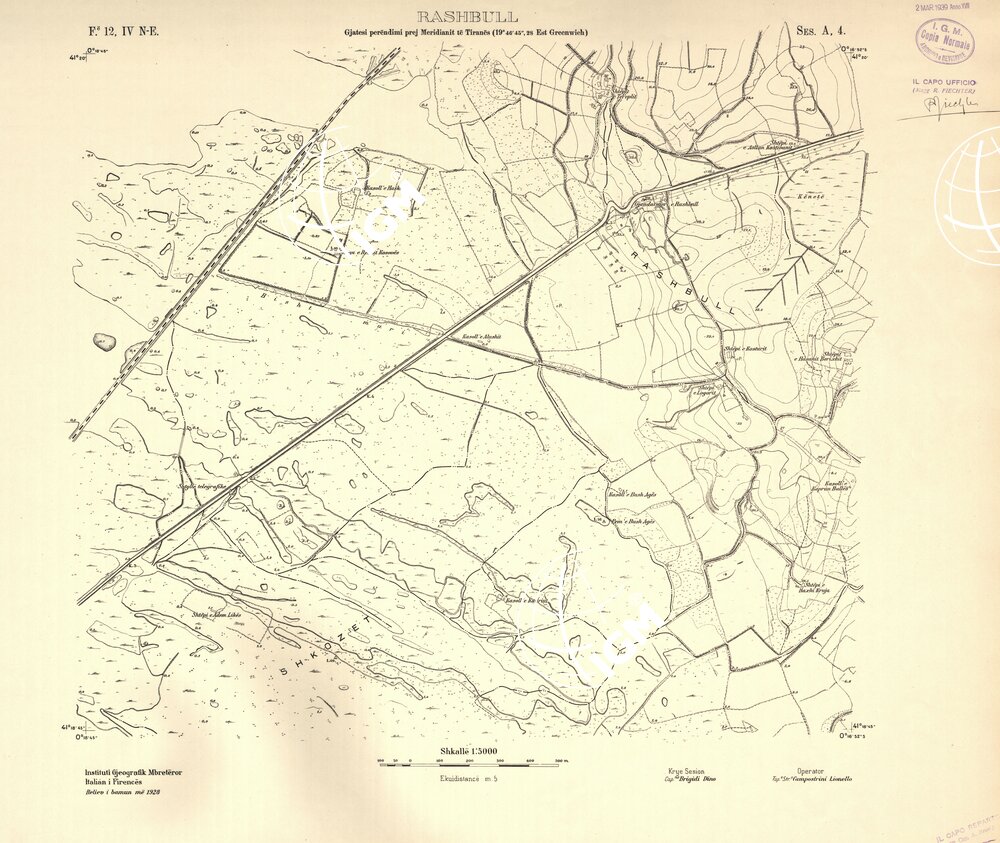 Rilievi alla scala di 1:5.000 eseguiti a scopo catastale per conto del Ministero delle Finanze Albanese negli anni 1927 1928 1929 in parte da operatori dell’ IGM e in parte, nella zona di Shijak, dalla ditta S.A.R.A. di Roma, alcune zone di particolare importanza furono rilevate alla scala di 1:2.500 ( Shijak dalla ditta S.A.R.A. Durazzo e Valona dall’ IGM )