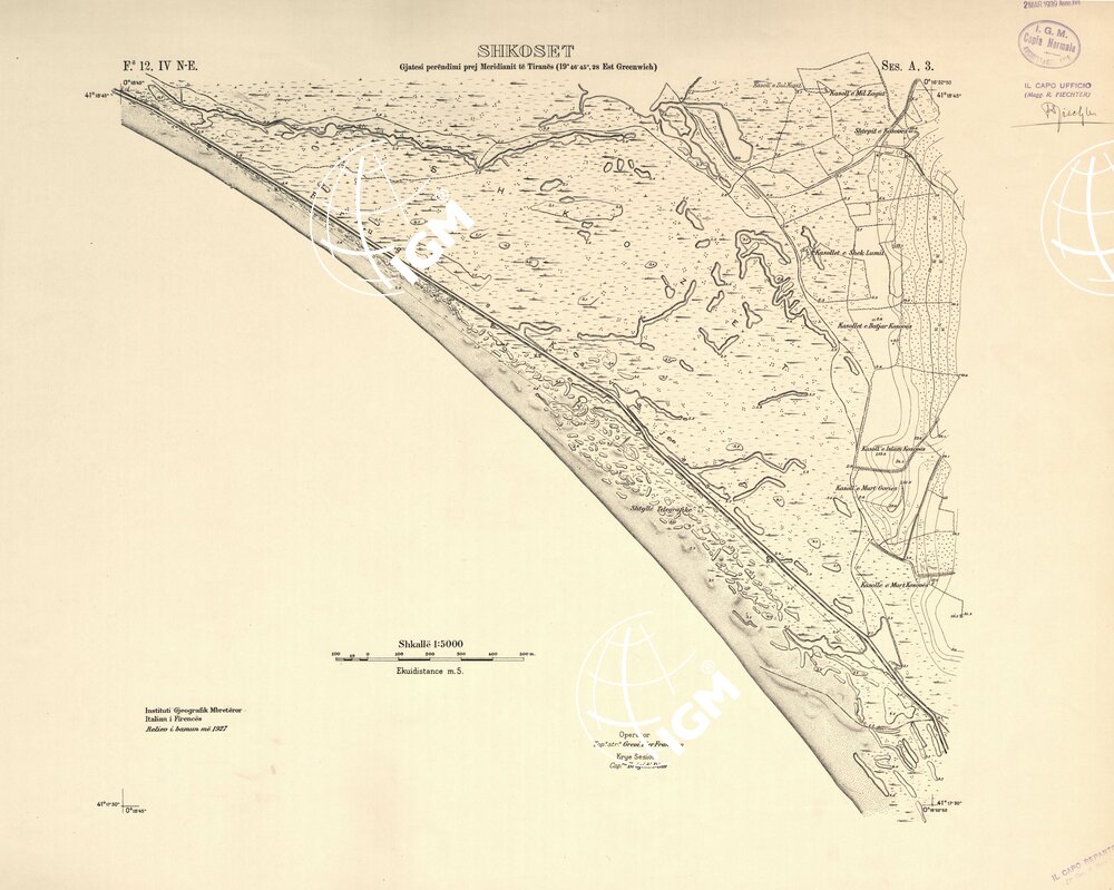 Rilievi alla scala di 1:5.000 eseguiti a scopo catastale per conto del Ministero delle Finanze Albanese negli anni 1927 1928 1929 in parte da operatori dell’ IGM e in parte, nella zona di Shijak, dalla ditta S.A.R.A. di Roma, alcune zone di particolare importanza furono rilevate alla scala di 1:2.500 ( Shijak dalla ditta S.A.R.A. Durazzo e Valona dall’ IGM )