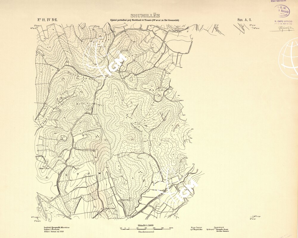 Rilievi alla scala di 1:5.000 eseguiti a scopo catastale per conto del Ministero delle Finanze Albanese negli anni 1927 1928 1929 in parte da operatori dell’ IGM e in parte, nella zona di Shijak, dalla ditta S.A.R.A. di Roma, alcune zone di particolare importanza furono rilevate alla scala di 1:2.500 ( Shijak dalla ditta S.A.R.A. Durazzo e Valona dall’ IGM )