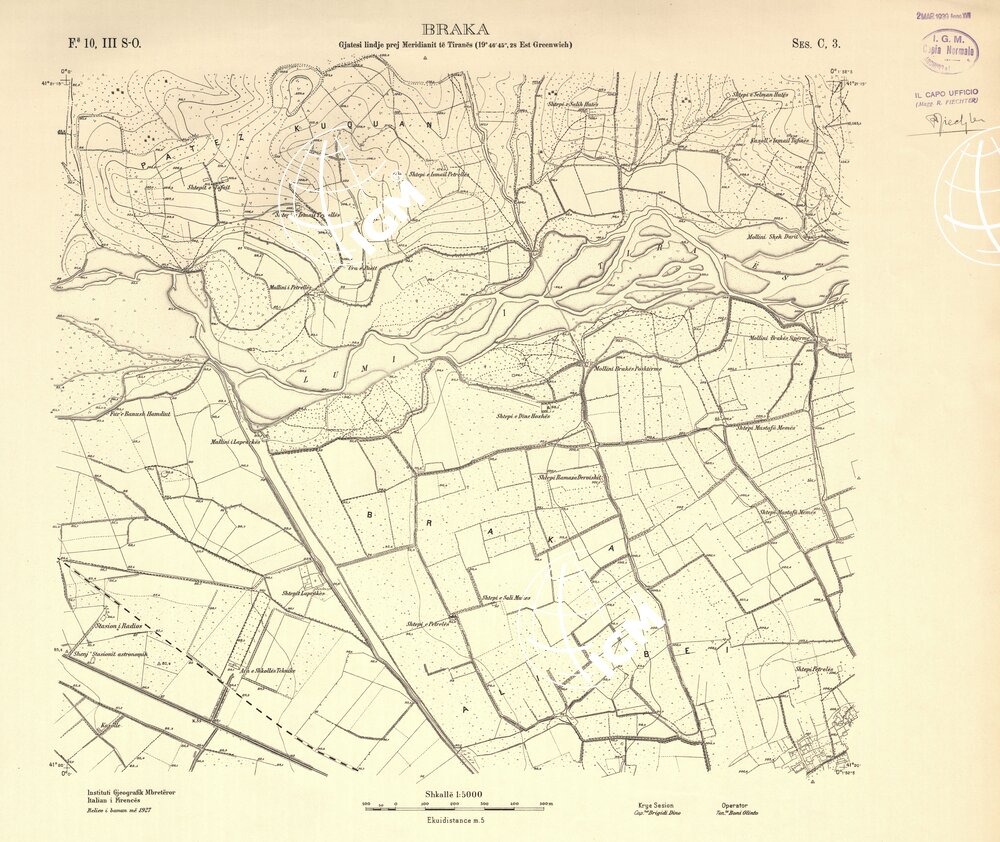 Rilievi alla scala di 1:5.000 eseguiti a scopo catastale per conto del Ministero delle Finanze Albanese negli anni 1927 1928 1929 in parte da operatori dell’ IGM e in parte, nella zona di Shijak, dalla ditta S.A.R.A. di Roma, alcune zone di particolare importanza furono rilevate alla scala di 1:2.500 ( Shijak dalla ditta S.A.R.A. Durazzo e Valona dall’ IGM )