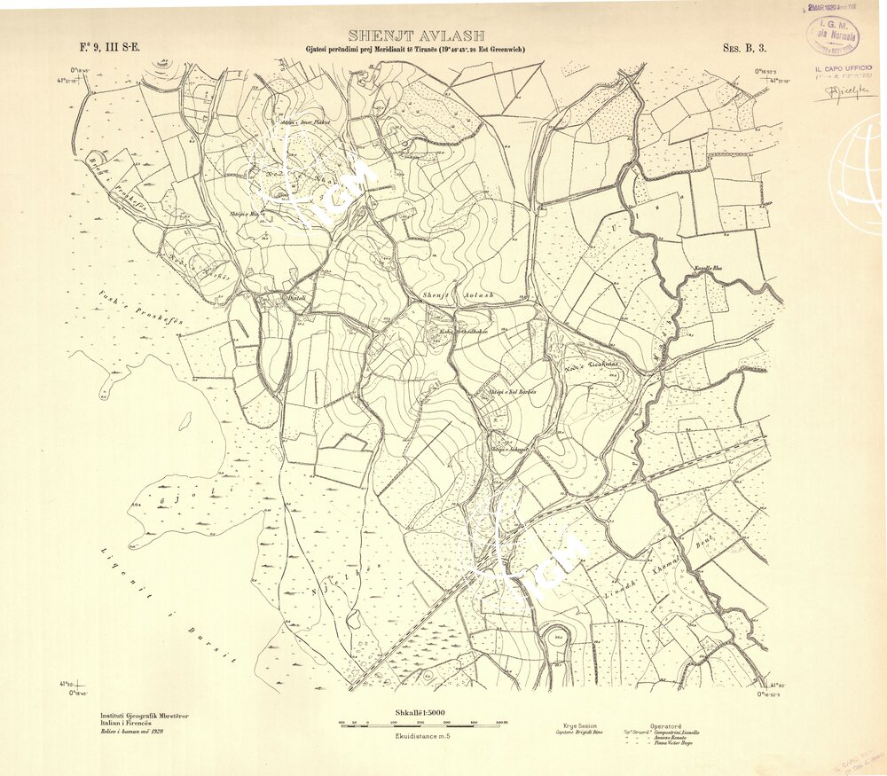 Rilievi alla scala di 1:5.000 eseguiti a scopo catastale per conto del Ministero delle Finanze Albanese negli anni 1927 1928 1929 in parte da operatori dell’ IGM e in parte, nella zona di Shijak, dalla ditta S.A.R.A. di Roma, alcune zone di particolare importanza furono rilevate alla scala di 1:2.500 ( Shijak dalla ditta S.A.R.A. Durazzo e Valona dall’ IGM )