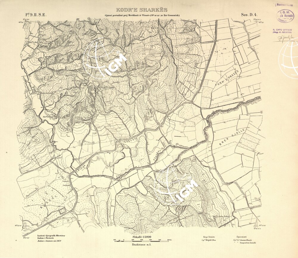 Rilievi alla scala di 1:5.000 eseguiti a scopo catastale per conto del Ministero delle Finanze Albanese negli anni 1927 1928 1929 in parte da operatori dell’ IGM e in parte, nella zona di Shijak, dalla ditta S.A.R.A. di Roma, alcune zone di particolare importanza furono rilevate alla scala di 1:2.500 ( Shijak dalla ditta S.A.R.A. Durazzo e Valona dall’ IGM )