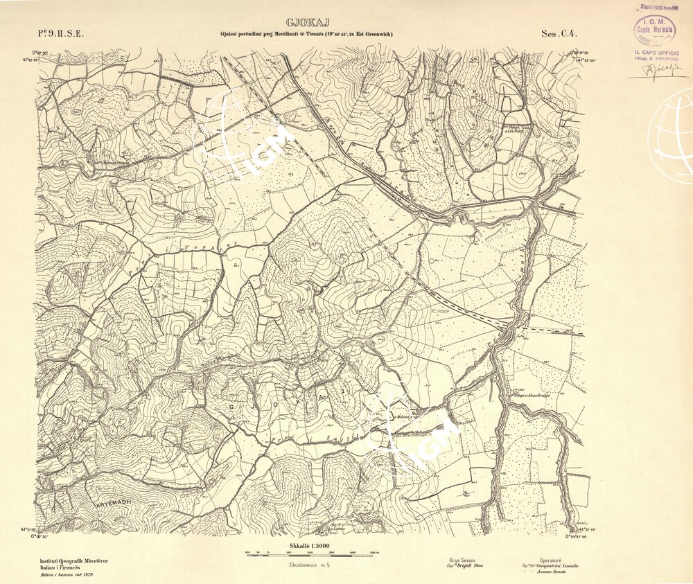 Rilievi alla scala di 1:5.000 eseguiti a scopo catastale per conto del Ministero delle Finanze Albanese negli anni 1927 1928 1929 in parte da operatori dell’ IGM e in parte, nella zona di Shijak, dalla ditta S.A.R.A. di Roma, alcune zone di particolare importanza furono rilevate alla scala di 1:2.500 ( Shijak dalla ditta S.A.R.A. Durazzo e Valona dall’ IGM )