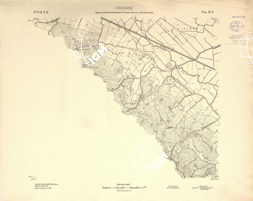 Rilievi alla scala di 1:5.000 eseguiti a scopo catastale per conto del Ministero delle Finanze Albanese negli anni 1927 1928 1929 in parte da operatori dell’ IGM e in parte, nella zona di Shijak, dalla ditta S.A.R.A. di Roma, alcune zone di particolare importanza furono rilevate alla scala di 1:2.500 ( Shijak dalla ditta S.A.R.A. Durazzo e Valona dall’ IGM )