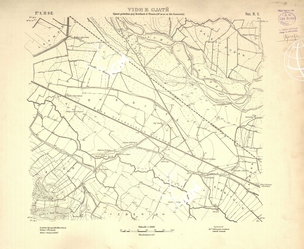 Rilievi alla scala di 1:5.000 eseguiti a scopo catastale per conto del Ministero delle Finanze Albanese negli anni 1927 1928 1929 in parte da operatori dell’ IGM e in parte, nella zona di Shijak, dalla ditta S.A.R.A. di Roma, alcune zone di particolare importanza furono rilevate alla scala di 1:2.500 ( Shijak dalla ditta S.A.R.A. Durazzo e Valona dall’ IGM )
