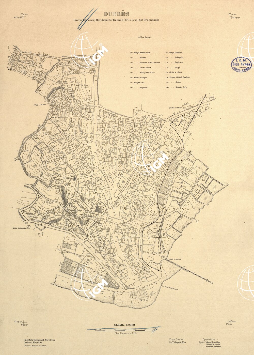 Rilievi alla scala di 1:5.000 eseguiti a scopo catastale per conto del Ministero delle Finanze Albanese negli anni 1927 1928 1929 in parte da operatori dell’ IGM e in parte, nella zona di Shijak, dalla ditta S.A.R.A. di Roma, alcune zone di particolare importanza furono rilevate alla scala di 1:2.500 ( Shijak dalla ditta S.A.R.A. Durazzo e Valona dall’ IGM )