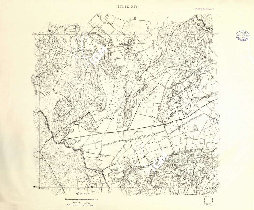 Rilievi alla scala di 1:5.000 eseguiti a scopo catastale per conto del Ministero delle Finanze Albanese negli anni 1927 1928 1929 in parte da operatori dell’ IGM e in parte, nella zona di Shijak, dalla ditta S.A.R.A. di Roma, alcune zone di particolare importanza furono rilevate alla scala di 1:2.500 ( Shijak dalla ditta S.A.R.A. Durazzo e Valona dall’ IGM )