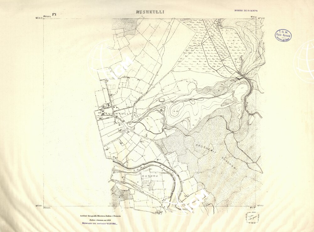 Rilievi alla scala di 1:5.000 eseguiti a scopo catastale per conto del Ministero delle Finanze Albanese negli anni 1927 1928 1929 in parte da operatori dell’ IGM e in parte, nella zona di Shijak, dalla ditta S.A.R.A. di Roma, alcune zone di particolare importanza furono rilevate alla scala di 1:2.500 ( Shijak dalla ditta S.A.R.A. Durazzo e Valona dall’ IGM )
